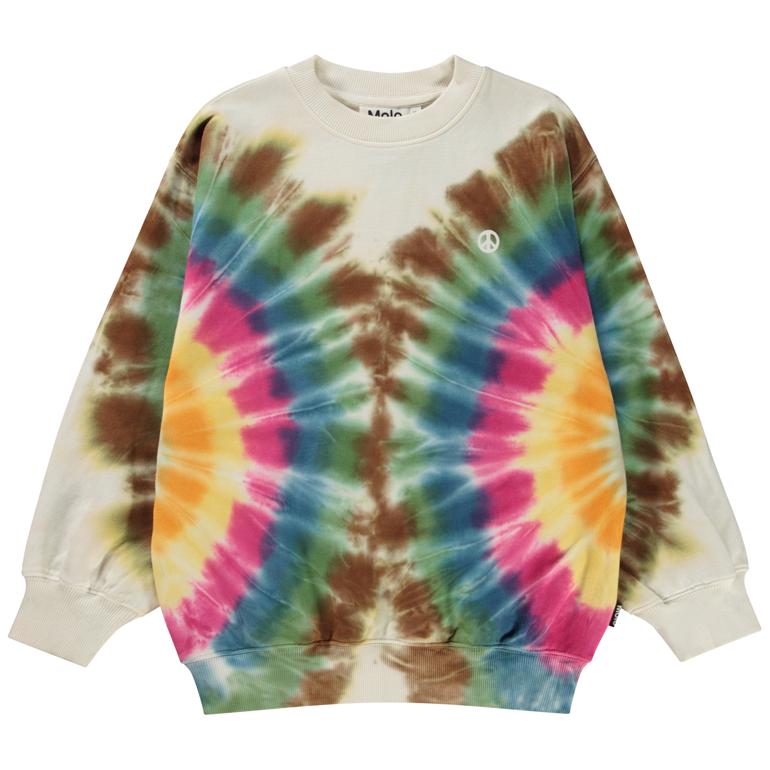 Multi-coloured sweatshirt with a tie-dye print that eminates from the sides and continues onto the front and back. It also has a small peace sign print on the front. This sweatshirt is in 100% cotton, and it has a round neck with a rib edge and rib at the sleeves and bottom. It is in a loose fit. Wear the sweatshirt with the Adan joggers in the same print for the perfect set.