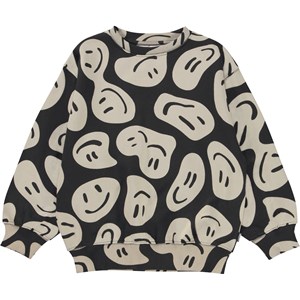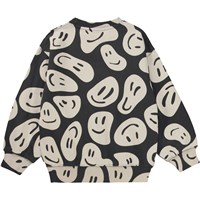 Black sweatshirt with a beige all over print of a lot of happy smiley faces that are floating around and being stretched and reshaped. This sweatshirt is in 100% cotton, has a round neck with a rib edge as well as rib at the sleeves and bottom. It is in a loose fit. Wear this sweatshirt with the Adan joggers in the same print for the perfect set.