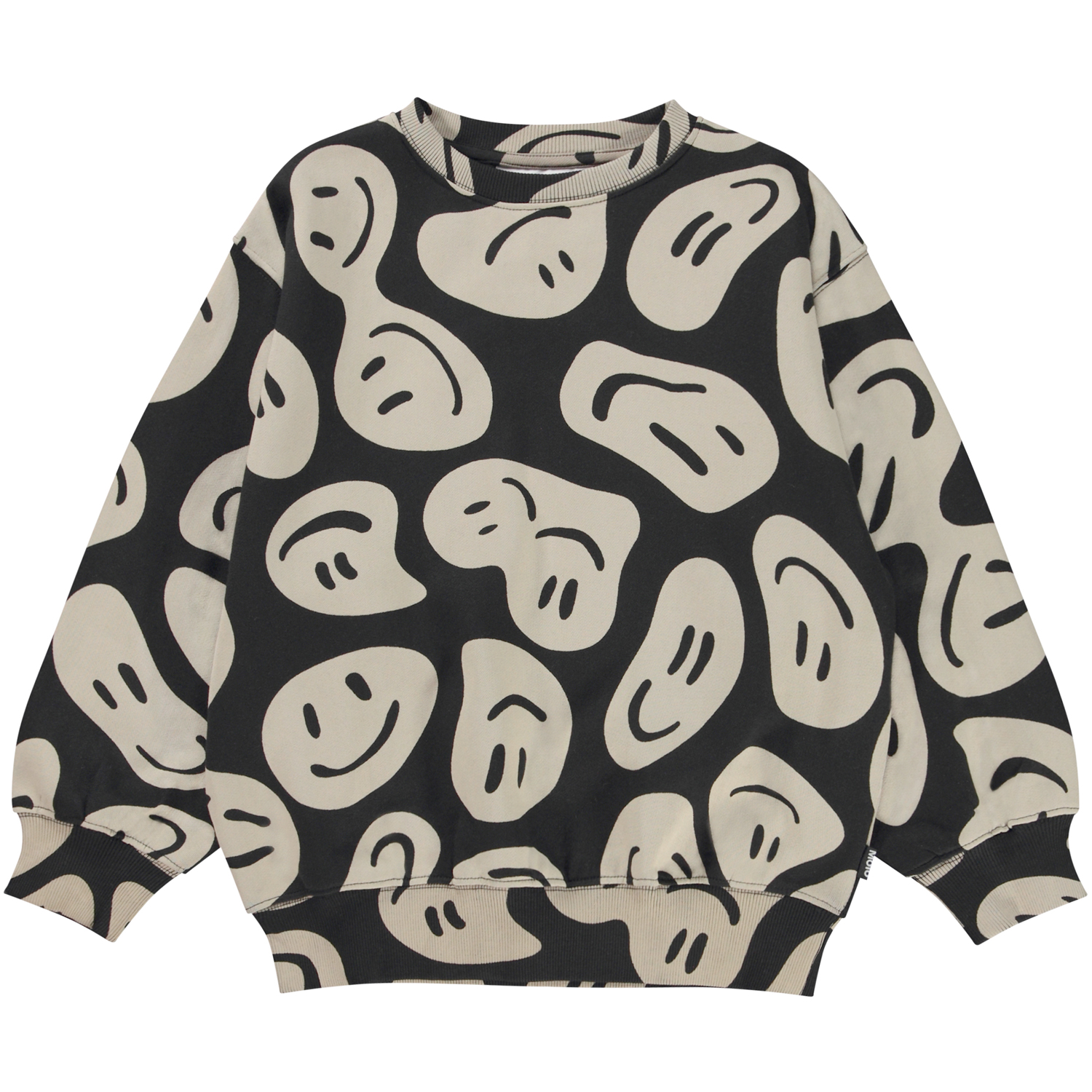 Black sweatshirt with a beige all over print of a lot of happy smiley faces that are floating around and being stretched and reshaped. This sweatshirt is in 100% cotton, has a round neck with a rib edge as well as rib at the sleeves and bottom. It is in a loose fit. Wear this sweatshirt with the Adan joggers in the same print for the perfect set.
