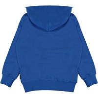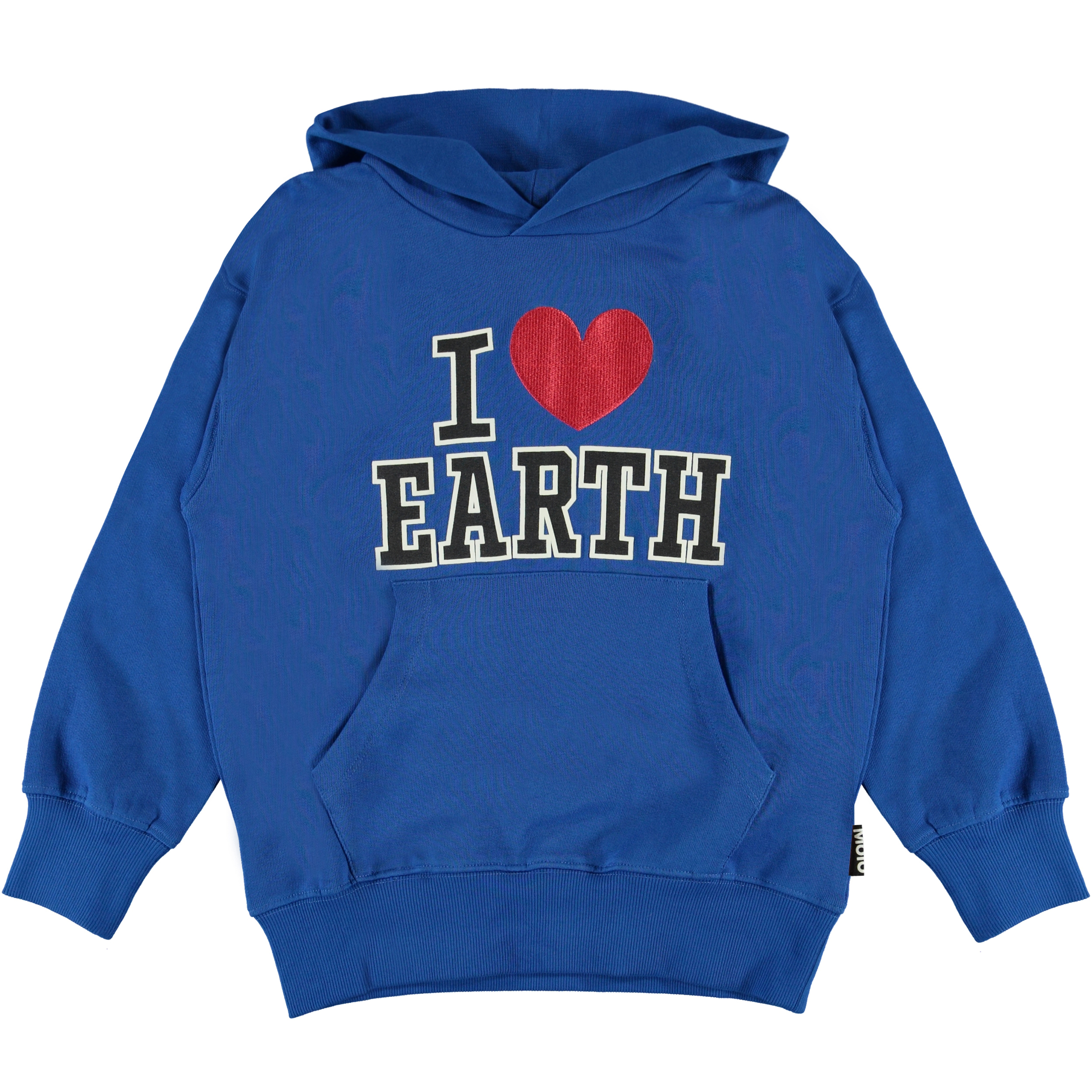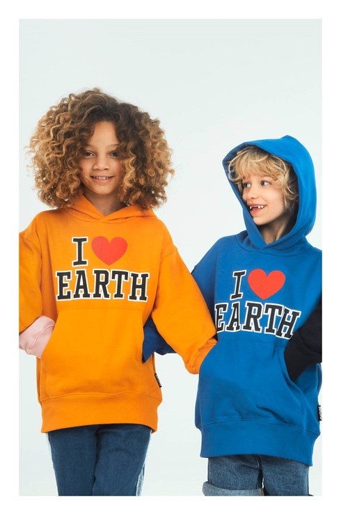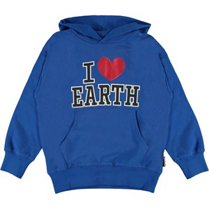 Moz is a blue hoodie with "I Love Earth" on the front. The hoodie has a pouch pocket and rib at the bottom and the end of the sleeves.