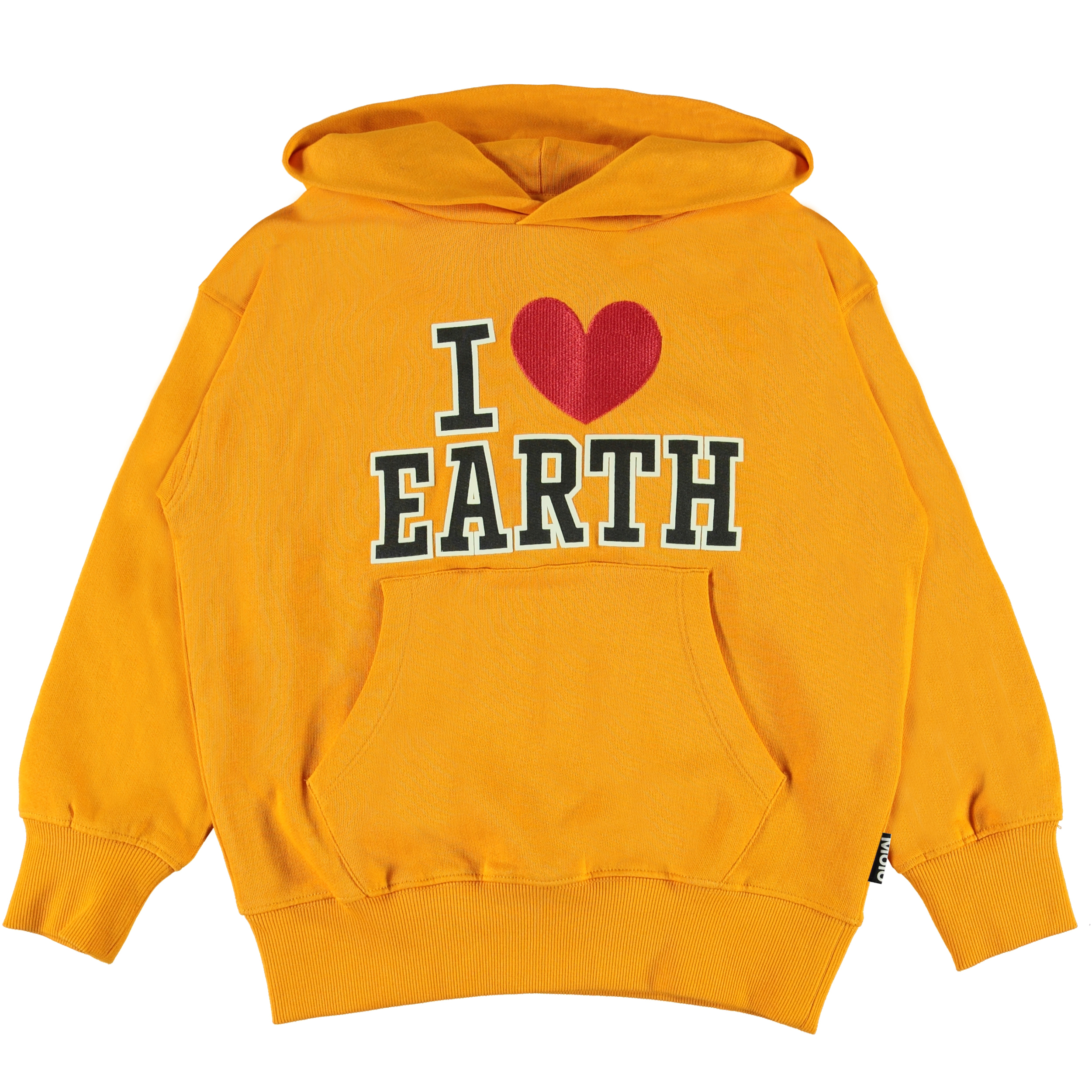 Moz is a orange hoodie with "I Love Earth" on the front. The hoodie has a pouch pocket and rib at the bottom and the end of the sleeves.