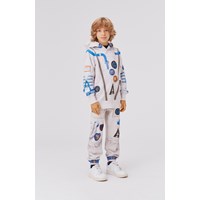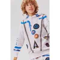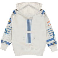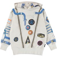 Moz is a white unisex hoodie with an astronaut print. It has pockets on the front. Moz has rib at the wrists and hip.