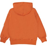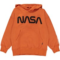 Orange hoodie with a black print on the front that says, "NASA", with "Space for All" down one sleeve. This hoodie is in 100% cotton, and it has a pouch pocket, rib at the sleeves and bottom and is in a loose fit. Wear the hoodie with the Adan joggers in the same print for the perfect set.