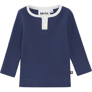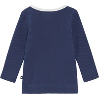 Earth is a dark blue baby top in a rib quality with a button closure and white edge at the neck. Wear it with matching trousers.