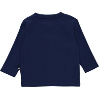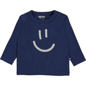 Elvo is a blue baby top with a print of a smiley face on the front.