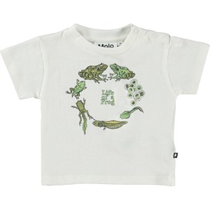 Enzo is a white baby t-shirt with a sweet print of the various stages of a frog's life cycle and with the text ’Life of a frog’. Enzo has an easy, two snap closure on one shoulder. The t-shirt is soft and comfortable and constructed in a cotton/linen blend.