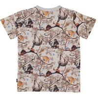 Ralphie is a rose coloured, crewneck t-shirt with a print of various young animals, living in nature in harmony. The t-shirt has short sleeves.