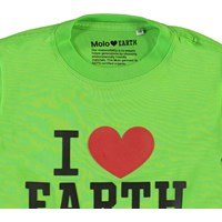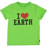 Reeve is a bright green t-shirt with "I Love Earth" on the front.