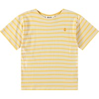 Beige and yellow t-shirt in soft organic cotton with short sleeves and inner neck tape. The t-shirt has a loose fit with a small embroidered peace sign on the chest.