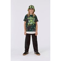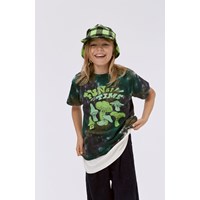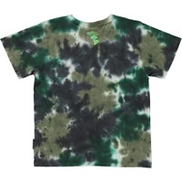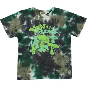 Green tie-dye t-shirt with a placement print on the front. The print is in clear, green nuances and has happy mushrooms, having fun. They are having a funky party, or is it a "Fungi” party? Two of the mushrooms have been dancing so hard that they've ended up on the back of the t-shirt. The print is placed on an all over tie-die background in shades of green. This t-shirt is in 100% organic cotton, and it has short sleeves and a round neck with a rib edge. It is in an loose fit.