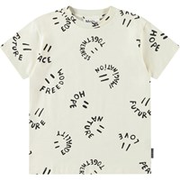 Off-white t-shirt in soft organic cotton with short sleeves and ribbed neckline. The t-shirt has a loose fit and an all-over print of smiling faces with words of joy as mouths.