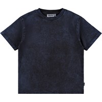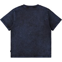 Blue T-shirt made of soft organic cotton with short sleeves and a ribbed neckline. The T-shirt has an oversized fit with a blue coated technique that creates a nice color play between blue and black.