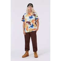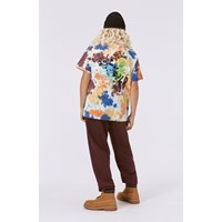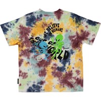 Multi-coloured t-shirt in an all over print. The print is a tie-dye in shades blue, bordeaux and yellow, and on top is a text in blue that reads, "Out of this World". The t-shirt also has a large print on the back of 2 aliens who believe that there is human life on other planets. This t-shirt is in 100% organic cotton, and it has short sleeves and a round neck with a rib edge. It is in an oversized fit.