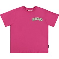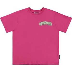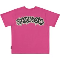 Pink t-shirt with a front and a large back print of a graffiti tag with the word, "Freedom" and a peace sign. This t-shirt is in 100% organic cotton, and it has short sleeves and a round neck with a rib edge. It is in an oversized fit.