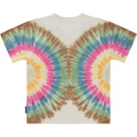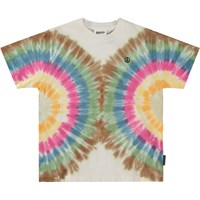 Multi-coloured t-shirt in a tie-dye print. The print is placed on the front and back, and the tie-dye pattern is shining out from its centre at the sides. This t-shirt is in 100% organic cotton, and it has short sleeves and a round neck with a rib edge. It is in an oversized fit.