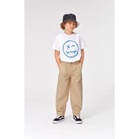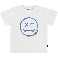 Roxo is a basic white t-shirt with a cheeky blue smiling face with a skateboard as a mouth.