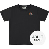 This is a black t-shirt for adults with a rainbow embroidery on the chest. It has short sleeves and a round neck.