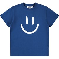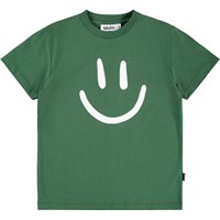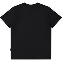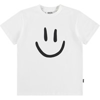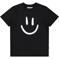 Black T-shirt made of soft organic cotton with short sleeves and a ribbed neckline. The T-shirt has a loose fit with a white print of a smiling face on the front.