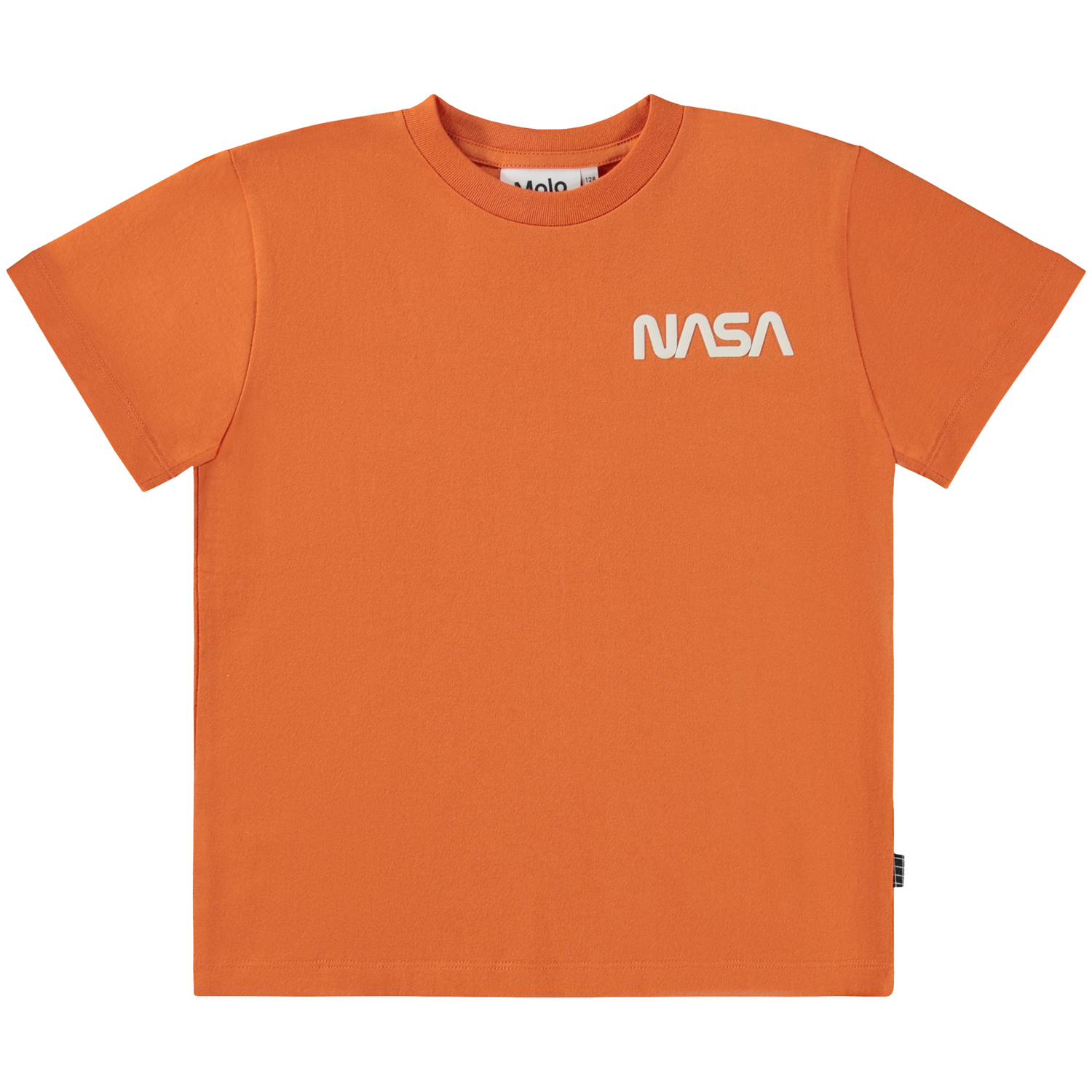 Orange t-shirt with a white NASA front print. 'Space for All' is printed on the side in white. This t-shirt is in 100% organic cotton, and it has short sleeves and a round neck with a rib edge. It is in a regular fit.