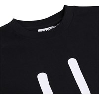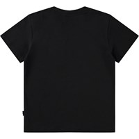 Black T-shirt made of soft organic cotton with short sleeves and ribbed neckline. The T-shirt has a loose fit with a print of a smiling face.