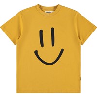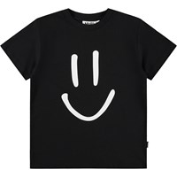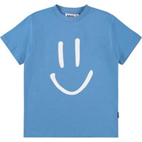 Purple T-shirt made of soft organic cotton with short sleeves and ribbed neckline. The T-shirt has a loose fit with a print of a smiling face.