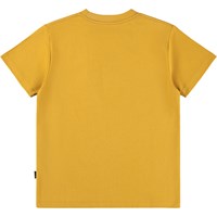 Yellow T-shirt made of soft organic cotton with short sleeves and ribbed neckline. The T-shirt has a loose fit with a print of a smiling face.