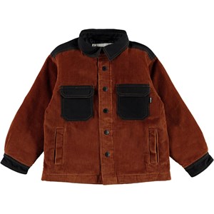 Henley is a brown overshirt jacket in corduroy. The jacket has black front pockets on the chest and collar and it has a botton closure. The Jacket has side pockets.