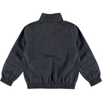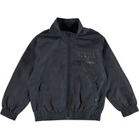 Tracksuit jacket in dark blue with zipper pockets. The jacket has elastic edges at the sleeves and hip. It has a printed text on the left chest. The jacket can be worn indoors and outdoors.