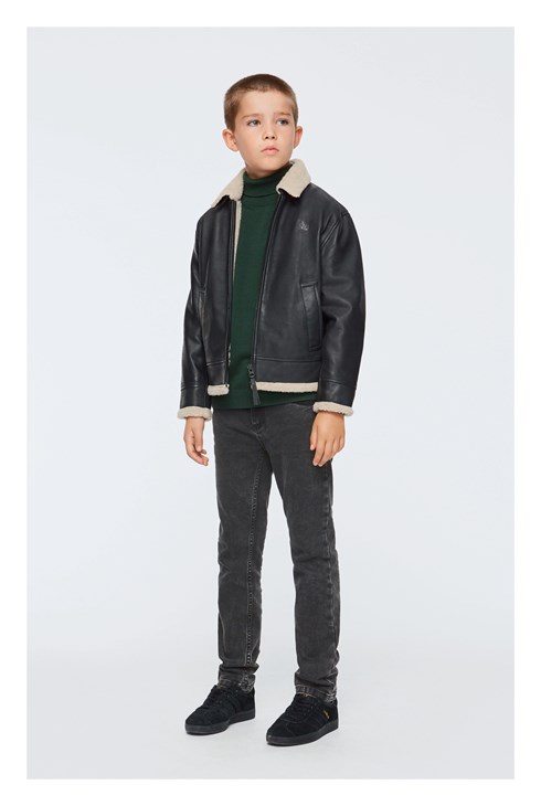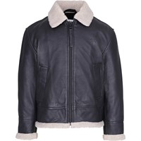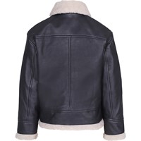 Black leather jacket in a soft lambskin quality with a collar and teddy fleece lining. The jacket has a zipper down the front, side pockets and Molo's logo on the chest.