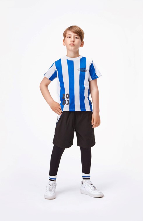 Acel is a pair of black sporty shorts with long, inner liners. They have white details at the sides and blue piping. Acel has a wide elastic waist and zip pockets. Wear the shorts with a matching jacket for a cool, comfrotable look.