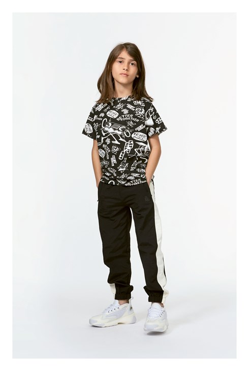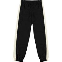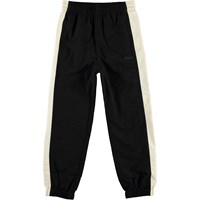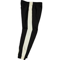 Acis is a pair of black track pants with a wide, white stripe down the sides of the legs. They have an elastic waist and rib at the legs.