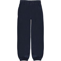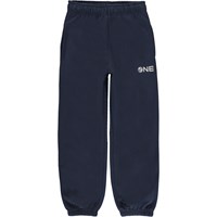 Adan is a pair of blue sweatpants with elastic at the waist and legs. Adan has pockets and "One" printed on the left side and on the back pocket.