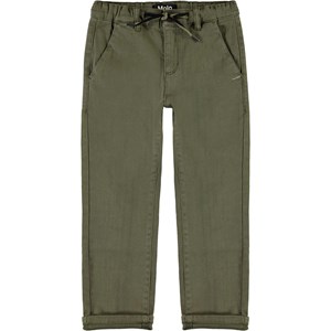 Aesy is a pair of chino trousers in khaki green with pockets and ties at the waist.