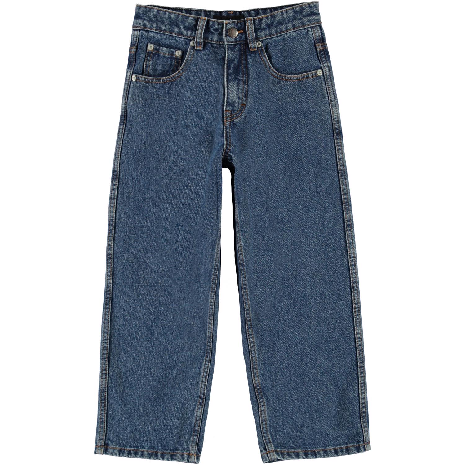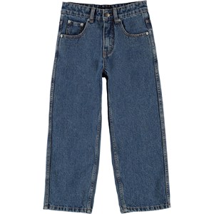 Aiden is Molo's new jeans, which have a cool, extra wide fit, inspired by the skater world. They have a roomy fit and the wide legs make them easy to move around in. These jeans have a slightly washed blue colour. The waist can be adjusted with an inner elastic so they fit every child. Aiden is constructed in 100% cotton, which makes them extra durable. Please note that sizes up to and including 134 have snap closures and not a jeans button.