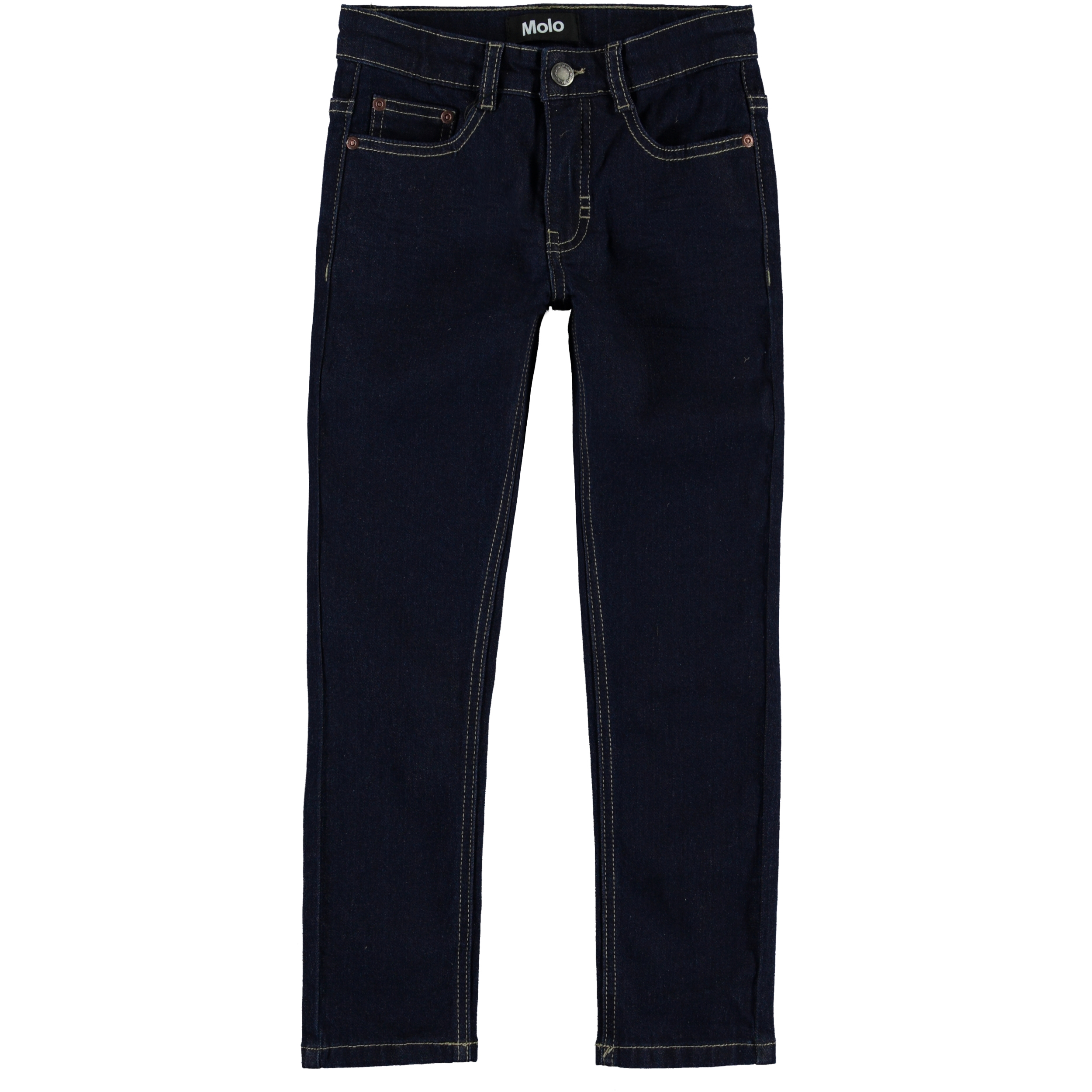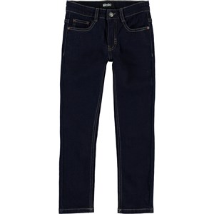 Aksel is a pair of slim fit denim jeans in dark blue with yellow stitching. They have a slight stretch. Please note that sizes to and including 134 have a snap closure instead of a jeans button.