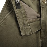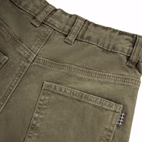 Green cotton canvas pants inspired by the skateboarding scene. The pants have a loose fit with wide legs and cool stitching at the knees that adds character. The design includes five practical pockets and a zip fly.
