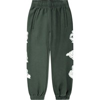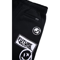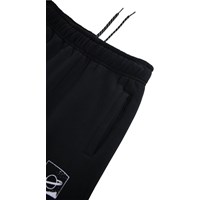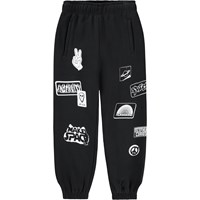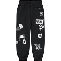 Black sweatpants made of organic cotton with an adjustable elastic waist, side pockets, a single back pocket and elastic around the ankles. The sweatpants have a regular fit and a white placed print of various icons from the collection down the legs.