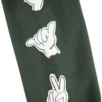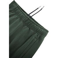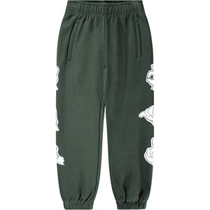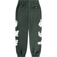 Green sweatpants made of organic cotton with an adjustable elastic waist, side pockets, a simple back pocket and elastic around the ankles. The sweatpants have a regular fit and a white hand sign print down the sides