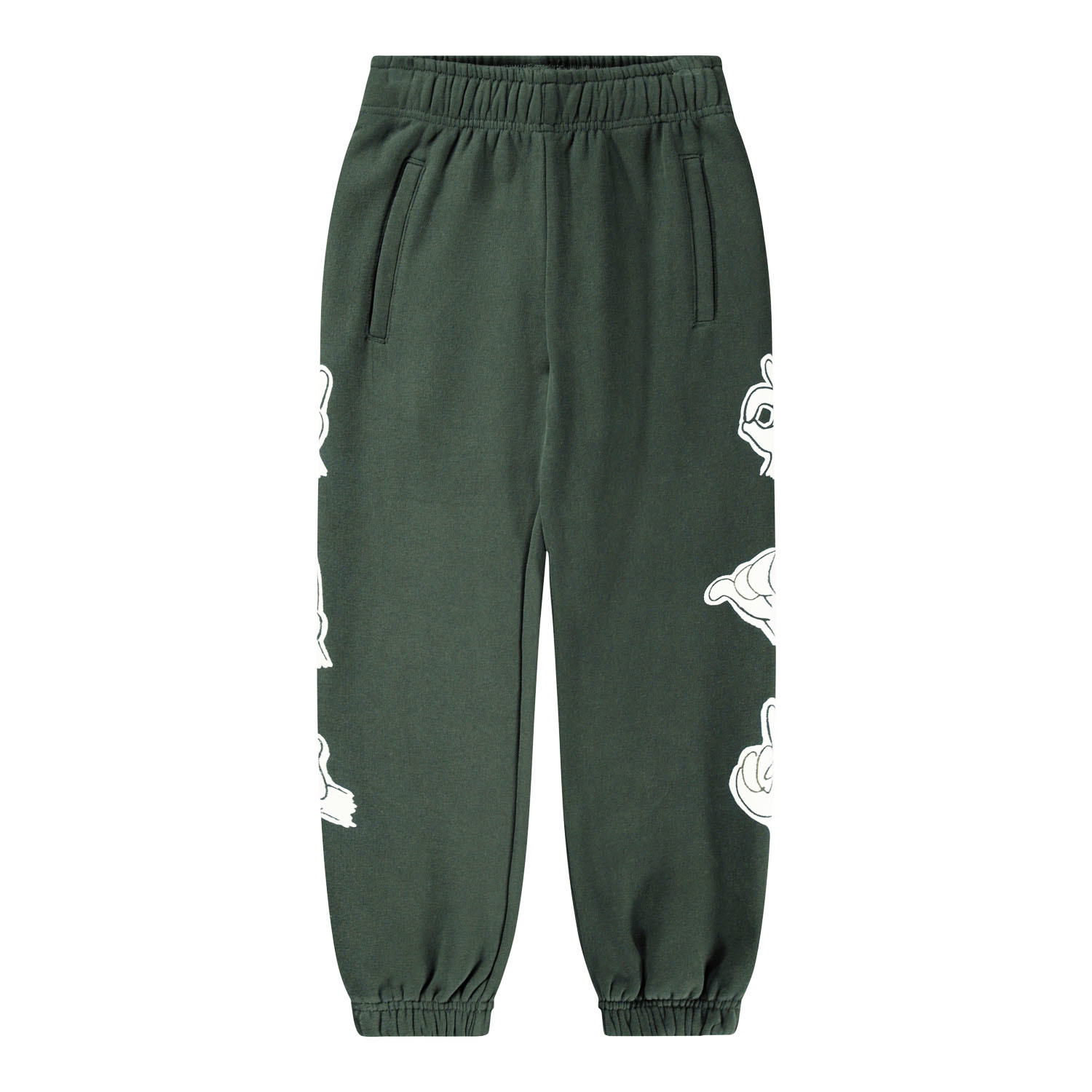 Green sweatpants made of organic cotton with an adjustable elastic waist, side pockets, a simple back pocket and elastic around the ankles. The sweatpants have a regular fit and a white hand sign print down the sides