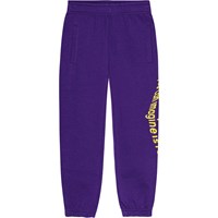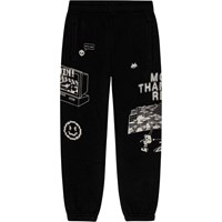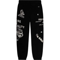 Black sweatpants made from organic cotton with an adjustable elastic waist, side pockets, a single back pocket, and elastic at the ankles. The trousers have a regular fit and a printed design running down one leg. The print is inspired by elements from video games and the virtual world, in white on black. The trousers have a brushed inner face making them soft and warm to wear.