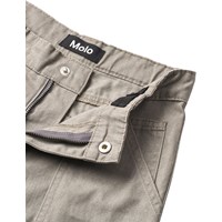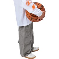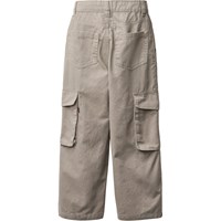 Grey trousers made of soft cotton with wide legs and large cargo pockets on the sides. The jeans have front and back pockets, belt loops, and an adjustable elastic waistband for an optimal fit. The smallest sizes (92-134) have a practical press stud, while sizes 140-176 are equipped with a classic jeans button.
