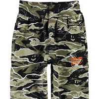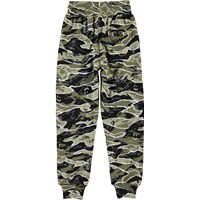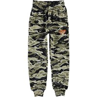 Alvar is a pair sporty sweatpants in a camouflage print with orange 'One World' embroidered on one leg. The trousers have a wide elastic waist and zip pockets.