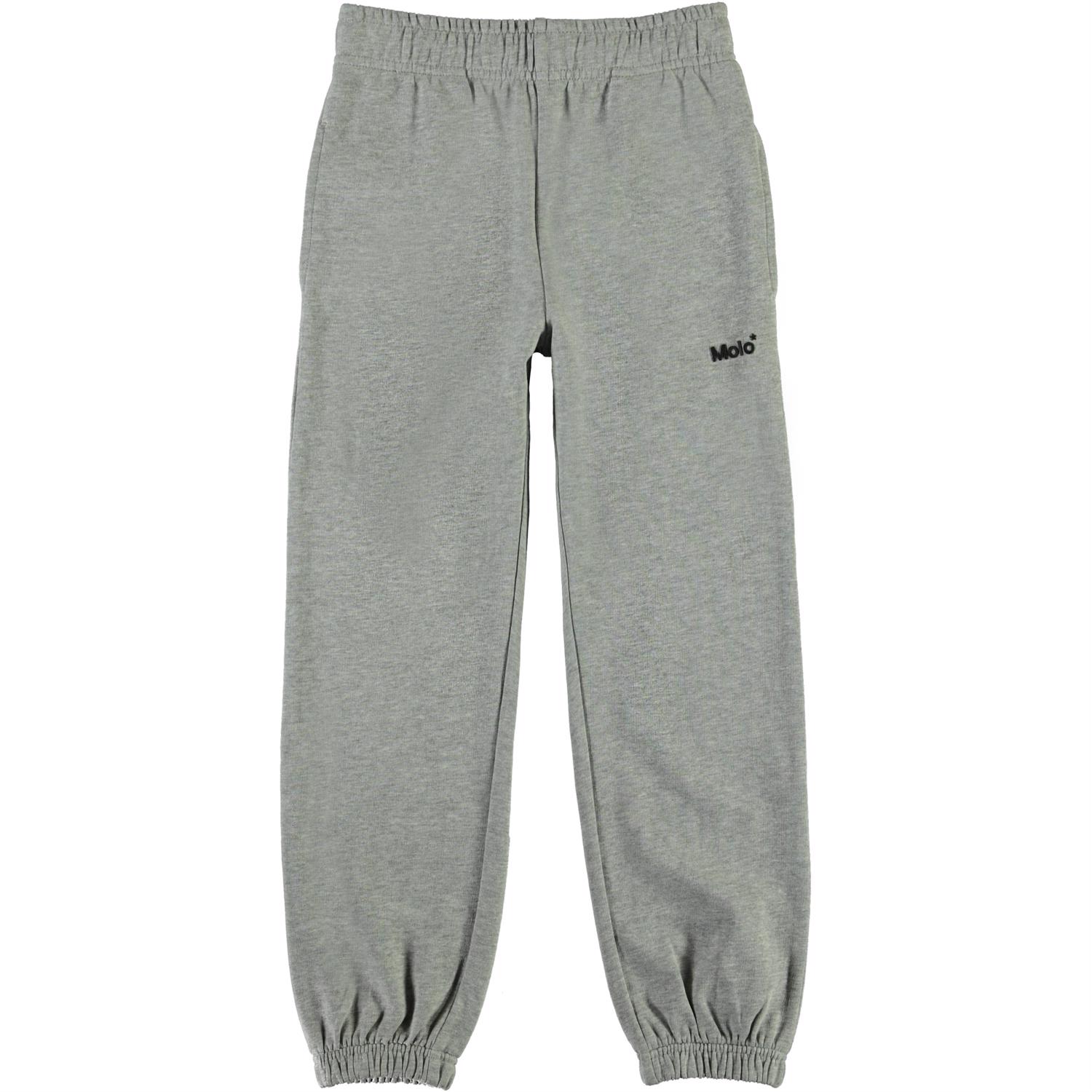 Am is a pair of black sweatpants with a Molo logo on the front and 'One world' printed over the back pocket. They have an elastic waist and leg openings.