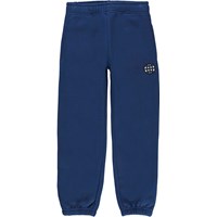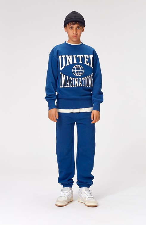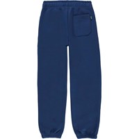 Am is a pair of dark blue sweatpants with elastic at the ankles and waist. Am has pockets, a globe patch at the left side and a patch pocket on the back.