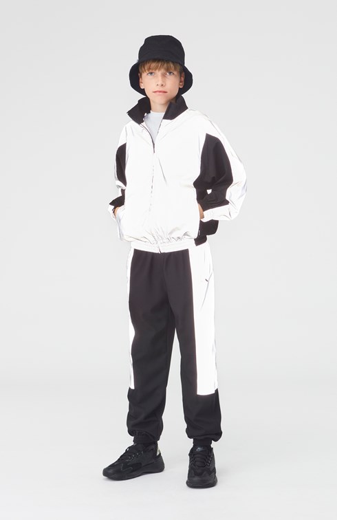 Amaz is a pair of black track pants with wide reflective sides that not only look cool but are super practical. They have an elastic waist and legs. Wear them with a matching track jacket for a sporty and cool look.