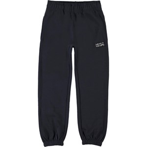Ams is a pair of dark blue sweatpants with a Molo logo on the front. They have an elastic waist and legs.