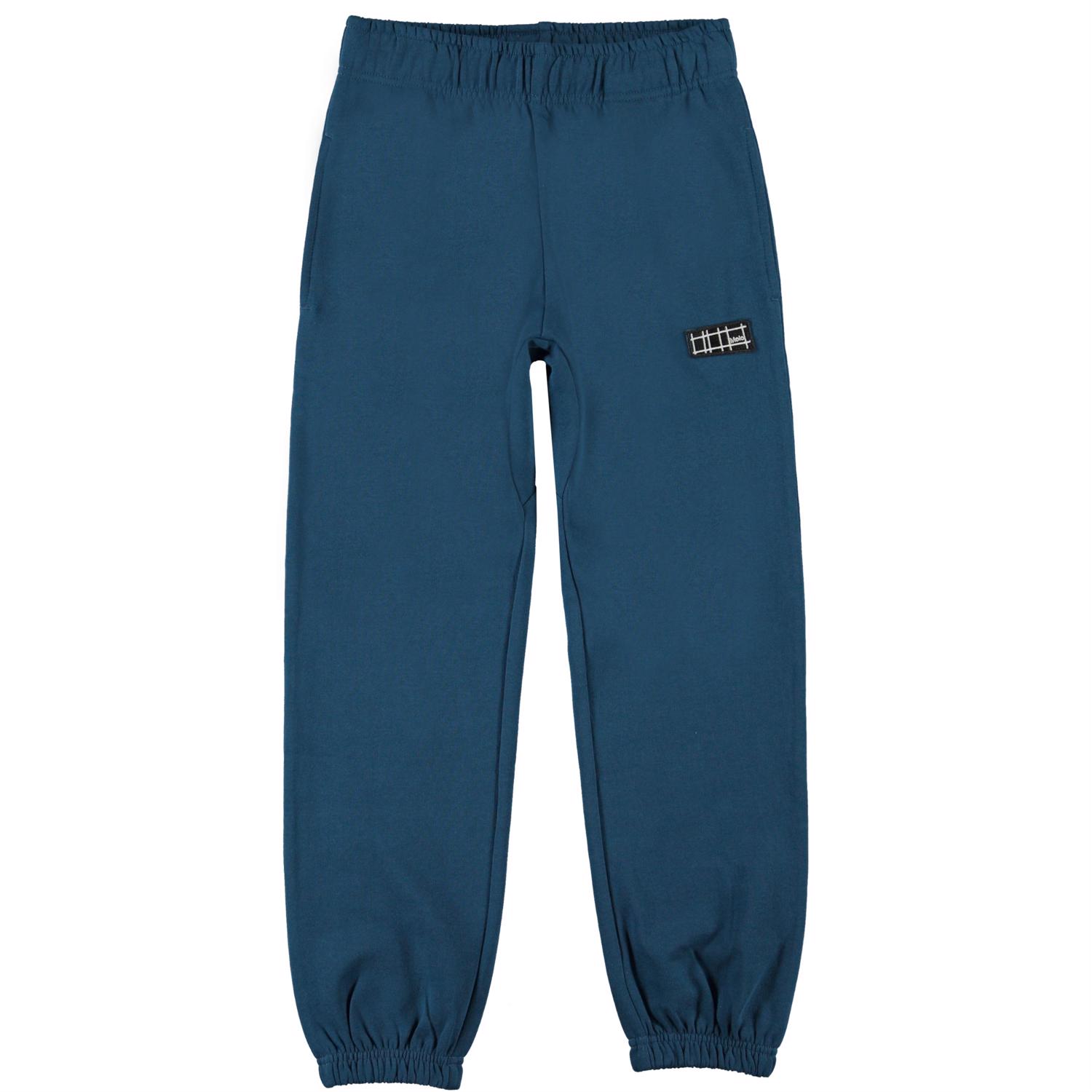 Ams is a pair of blue sweatpants with a Molo logo on the front. They have an elastic waist and legs.