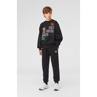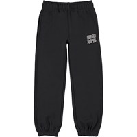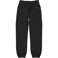 Am is a pair of black sweatpants with a white print of the four elements on one pocket. The sweatpants have an elastic waist and legs.
