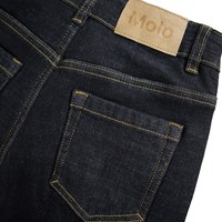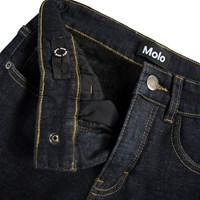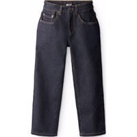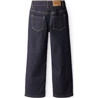 Dark blue denim jeans made from cotton. The trousers feature 5 pockets and a regular loose fit. The waistband can be adjusted with an internal elastic for an optimal fit for all children. Sizes 92–134 have a press stud for easy dressing, while sizes 140–176 are fitted with a regular jeans button.