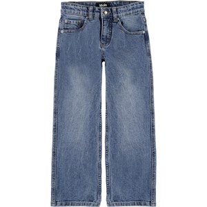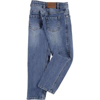 Andy is a pair of jeans in a medium blue denim. Andy has front and back pockets and a brown leather logo patch. This Molo product is made of certified organic cotton.